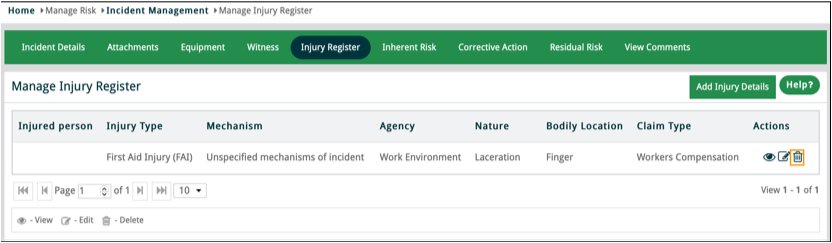 We have added an additional function to enable the deletion of a record made in error within the Incident Management > Injury Register.