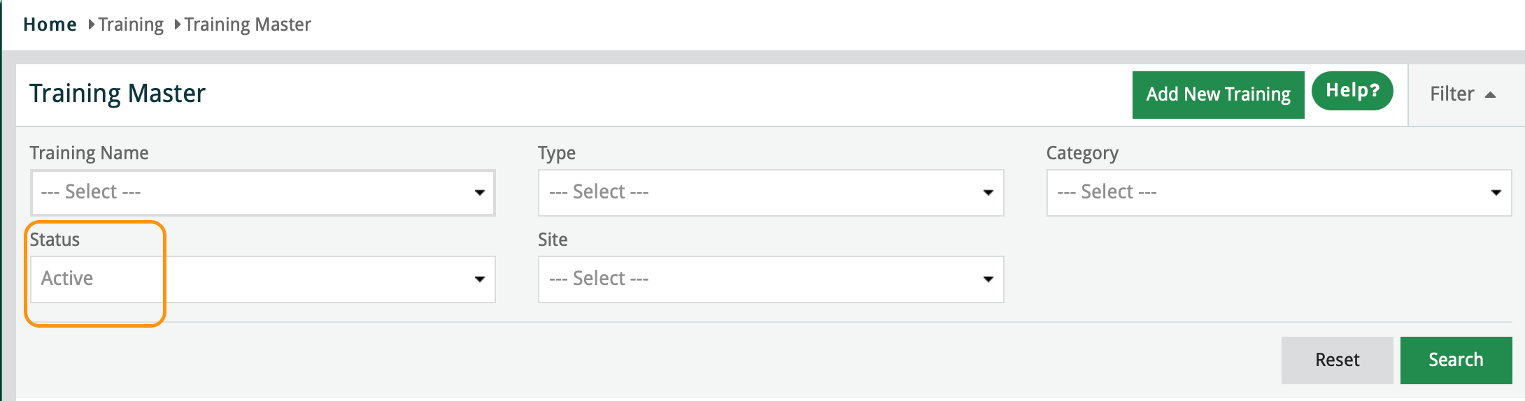 Training Master: on this page, the Status by default will display only the “Active” Training Masters so when searching the Training Name, only the active display.
